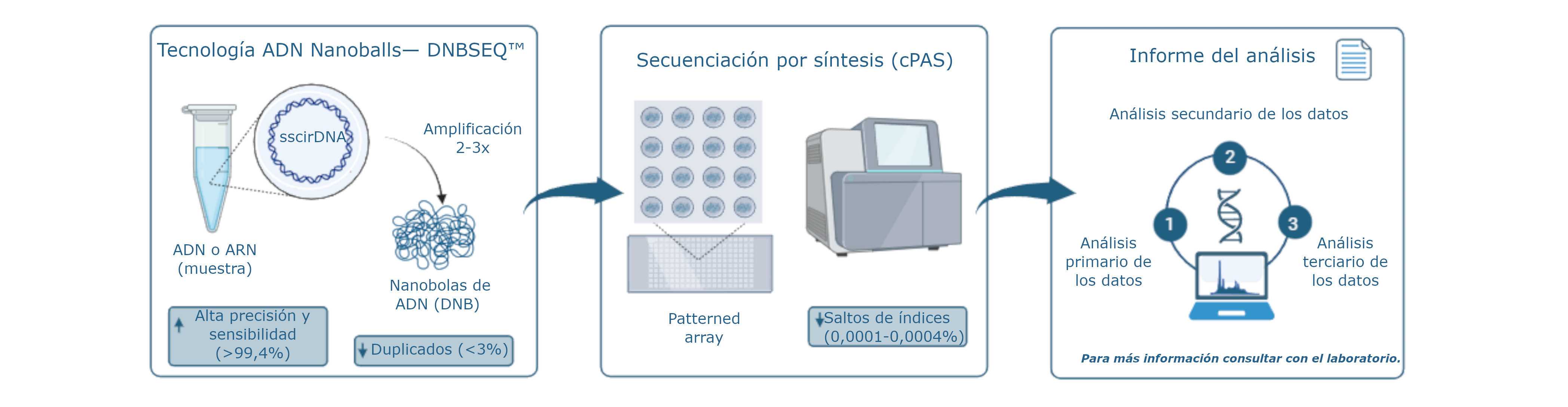 Esta tecnología llamada DNBSEQ, se basa en nanobolas de ADN (DNB). Creadas durante la preparación de librerías, las DNB compactas se cargan en celdas de flujo y la secuencia se lee con cuatro sondas fluorescentes que reconocen cuatro bases de ADN. A continuación, se utilizan láseres para excitar las sondas, mientras se toman millones de imágenes para identificar las bases. Estas imágenes pasan por un análisis de imágenes y posteriormente un análisis bioinformático para identificar las variantes patogénicas y probablemente patogénicas encontradas.